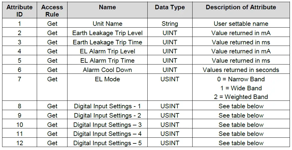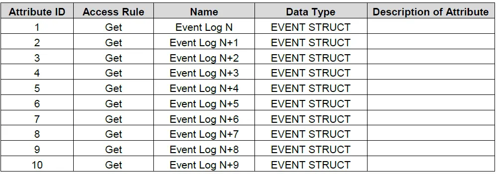 The ELV-PRO stores the last 50 events. The events are stored from new to old; as a new event is created an old event is deleted (provided that the 50 event spaces are full). To allow the PLC to access these events, the ELV-PRO presents them as 5 instances, each containing 10 encoded event structures. Instance 1 contains the most recent event logs (with the first attribute containing the most recent event log). All events stored within an instance can be read using the ‘Get_Attributes_All’ service as described below.