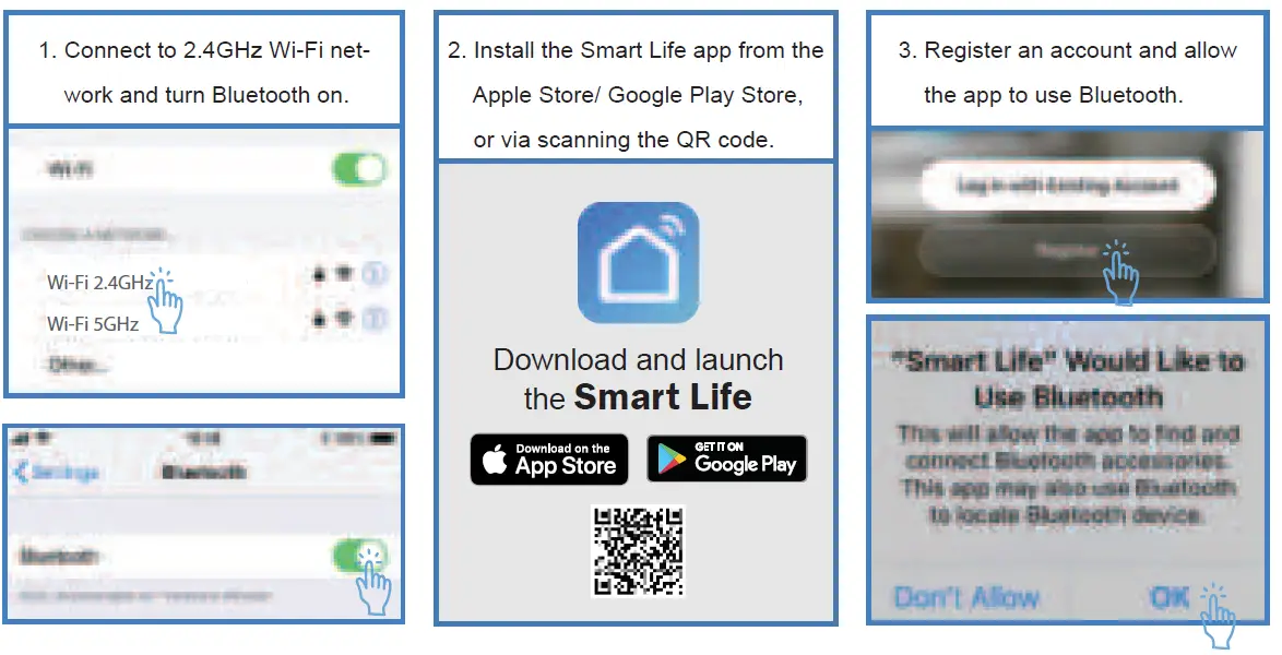2. Install the Smart Life app from the Apple Store/ Google Play Store, or via scanning the QR code.