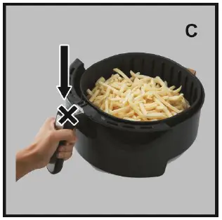 CAUTION: WHEN REMOVING OUTER BASKET, BE CAREFUL NOT TO PRESS THE BASKET HANDLE BUTTON. OUTER BASKET WILL SEPARATE FROM FRY BASKET. (Fig. C)